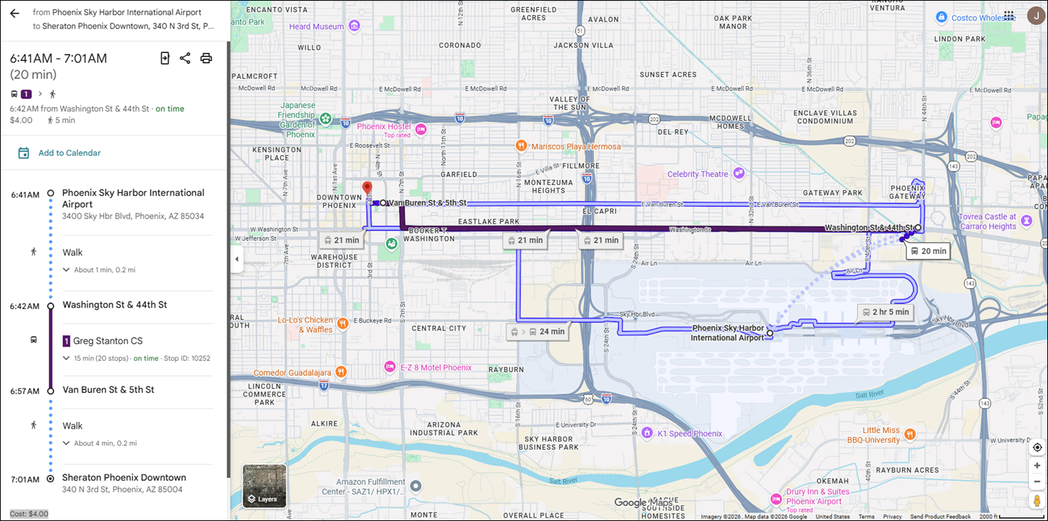 The image below is from Google Maps. To get it on your device, go to Google Maps and choose the mass transit travel option from Phoenix Sky Harbor airport to the Sheraton Phoenix Downtown hotel.